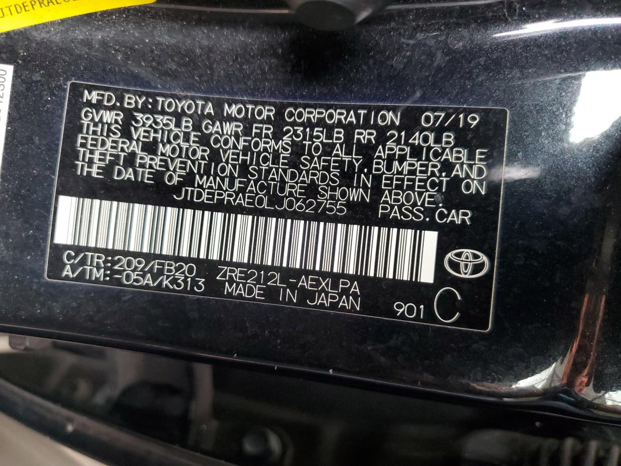 Place of sale and operation of a car with a license plate JTDEPRAE0LJ062755