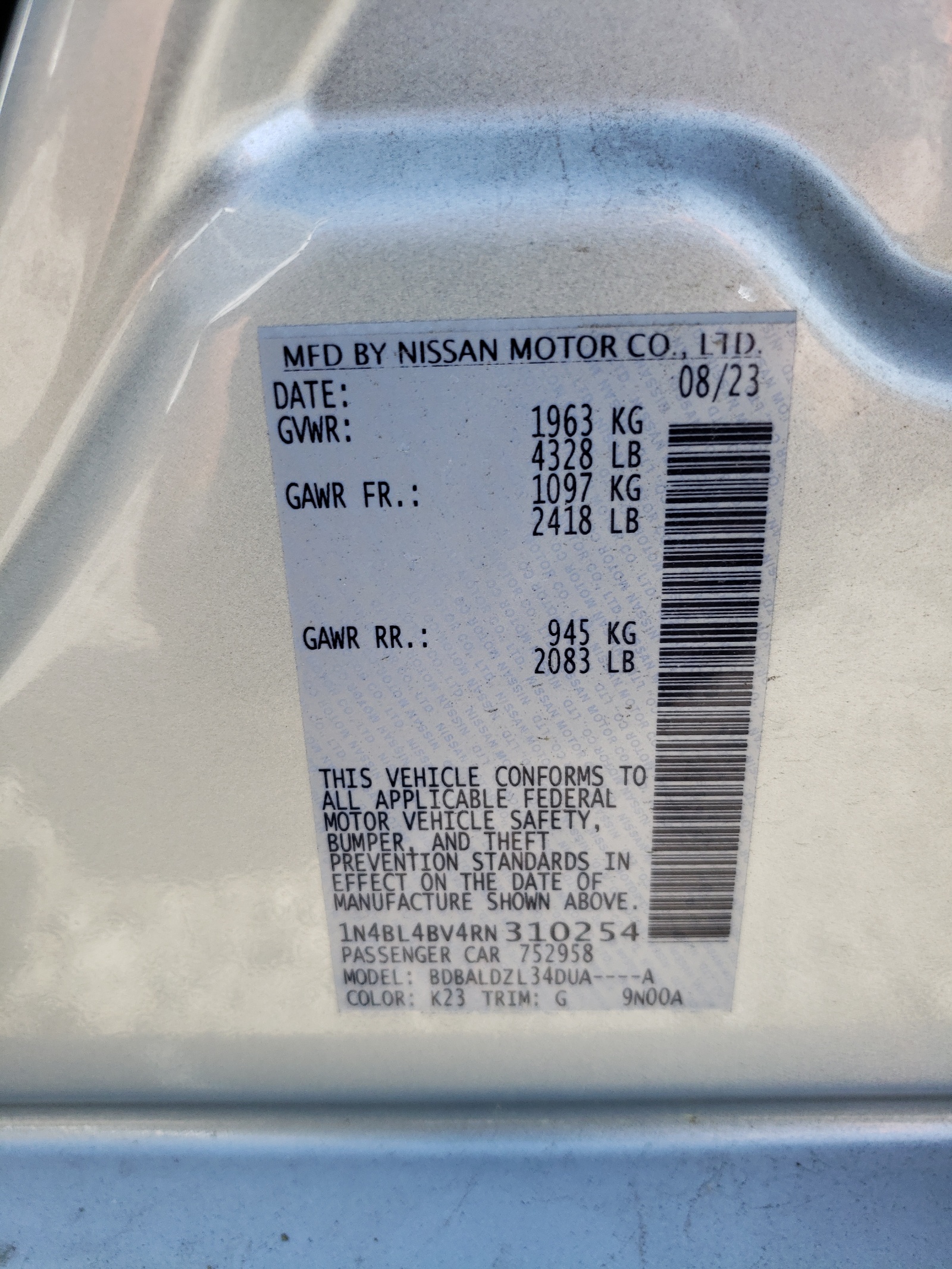 Place of sale and operation of a car with a license plate 1N4BL4BV4RN310254